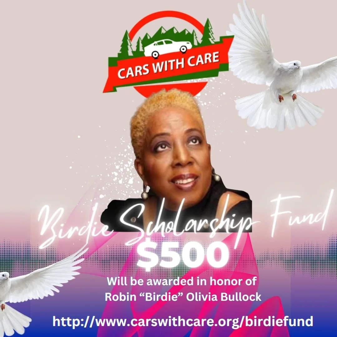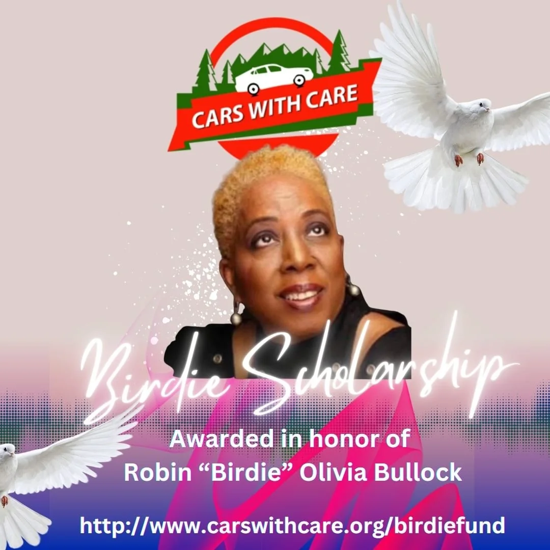 The “Birdie” Scholarship Fund was instituted by the Cars With Care team in 2021 to honor and commemorate the life of our Co-Founder, Damond Horne’s late mother, Robin “Birdie” Olivia Bullock. The scholarship will be awarded to an incoming college freshman who has exhibited the values and work ethic held dear to Mrs. Bullock during their high school tenure. It is the hope of the family that this fund will serve as an aid in the continuation of the recipient’s education and encouragement to continue upholding the values and principles that brought them this far.